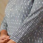 Design: Featuring a vertical pinstripe pattern with a contrasting chevron-style yoke detail at the front. It has a Band collar with a short button placket, adding a structured yet minimal look. The three-quarter sleeves and straight hemline