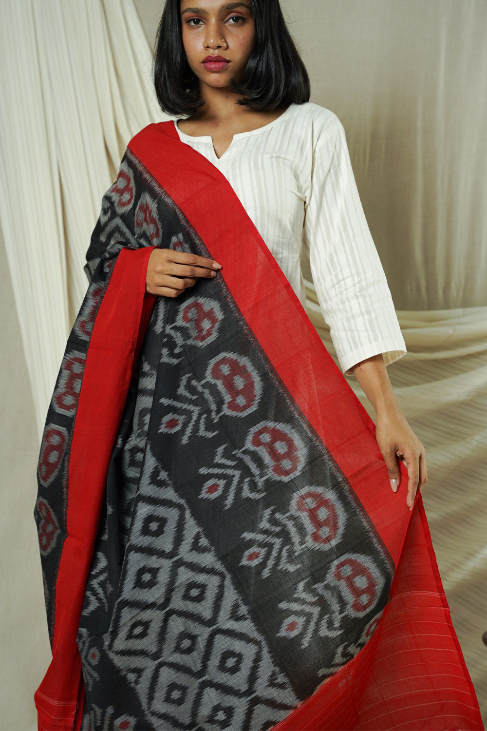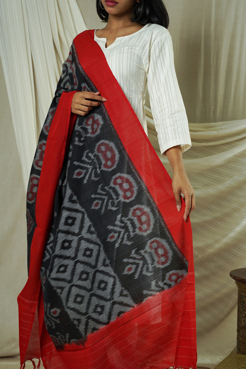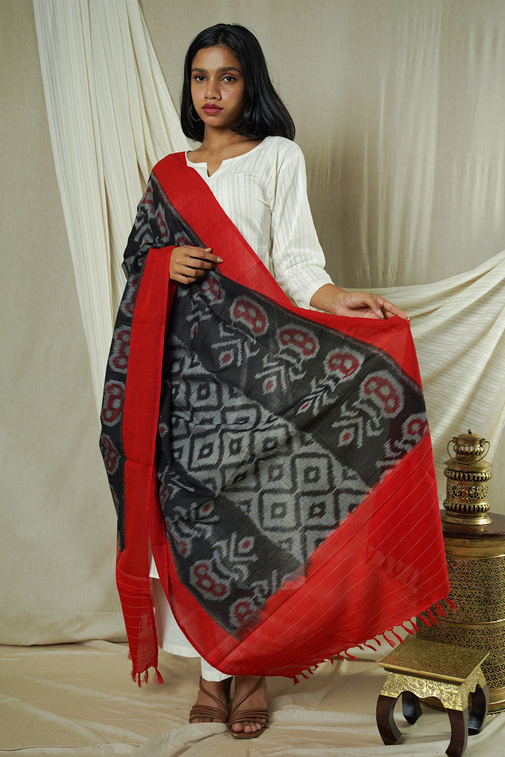 Hand Woven Double Ikkat Cotton Duppata - Black