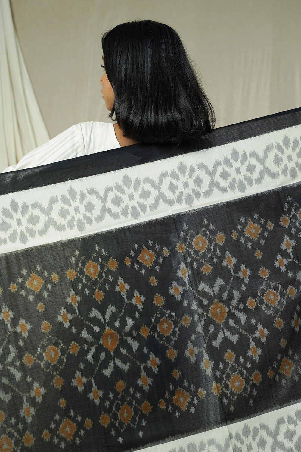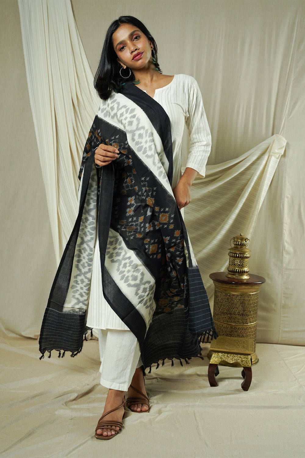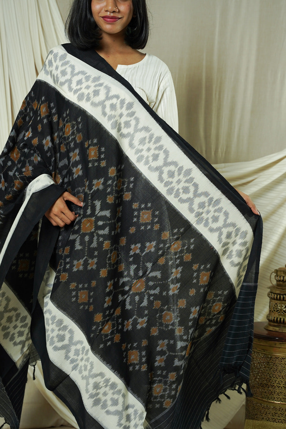 Hand Woven Double Ikkat Cotton Duppata - Black