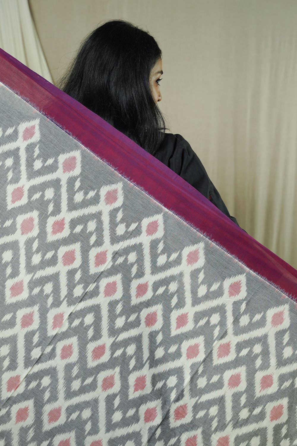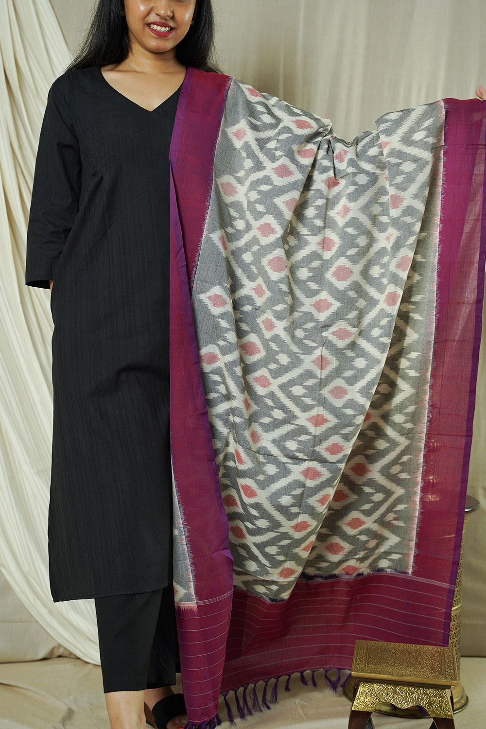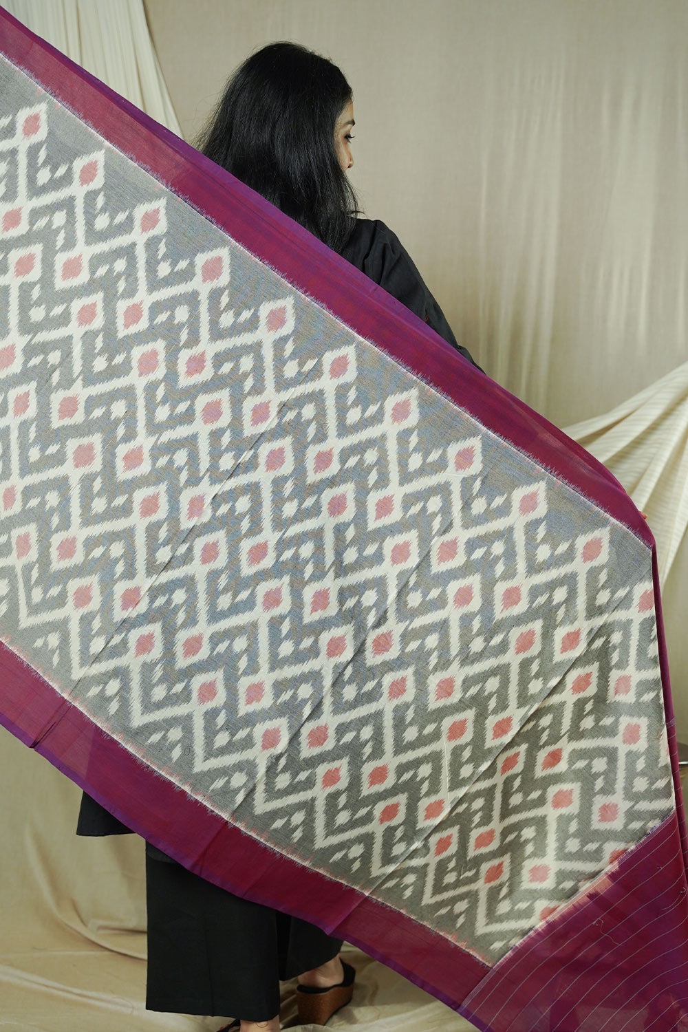 Hand Woven Double Ikkat Cotton Duppata - Grey