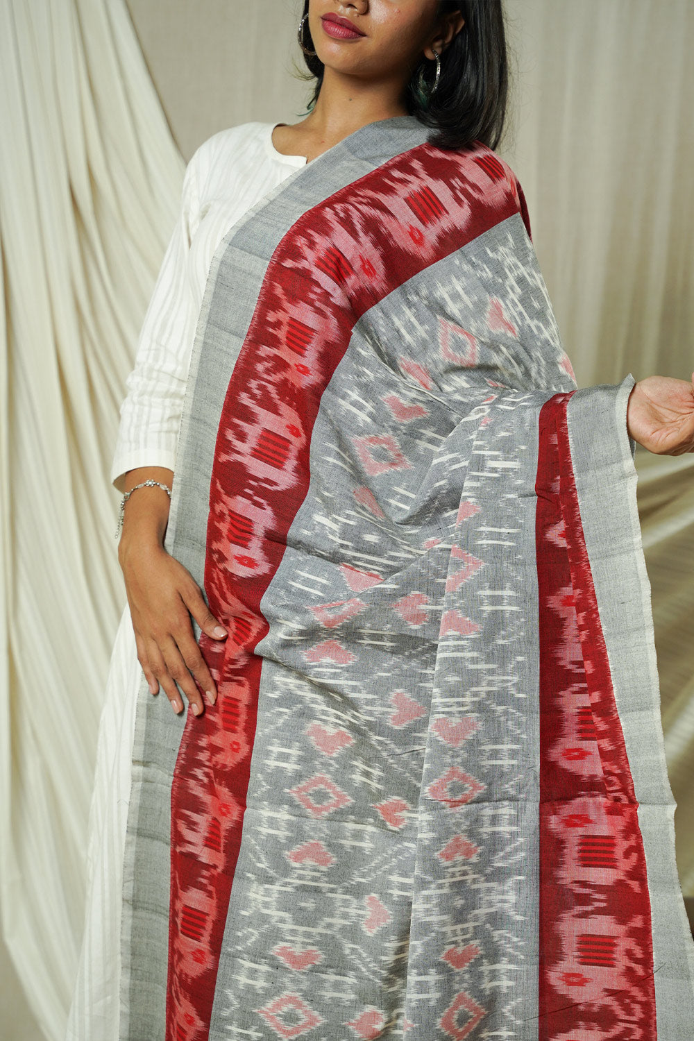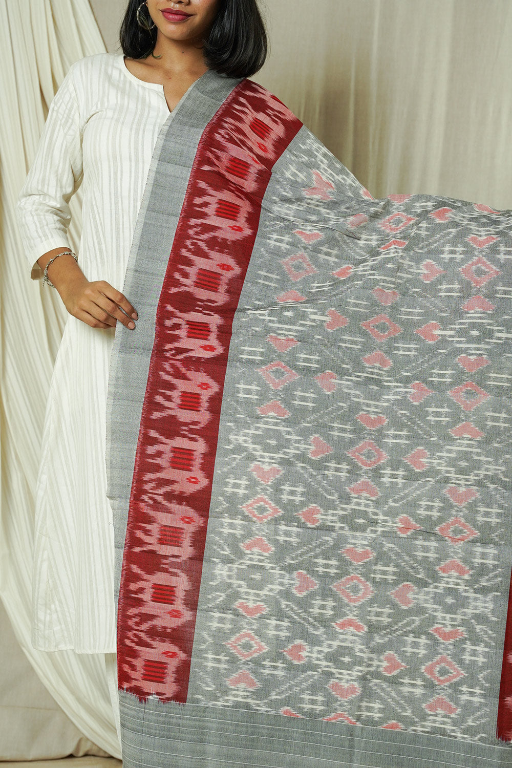 Hand Woven Double Ikkat Cotton Duppata - Grey