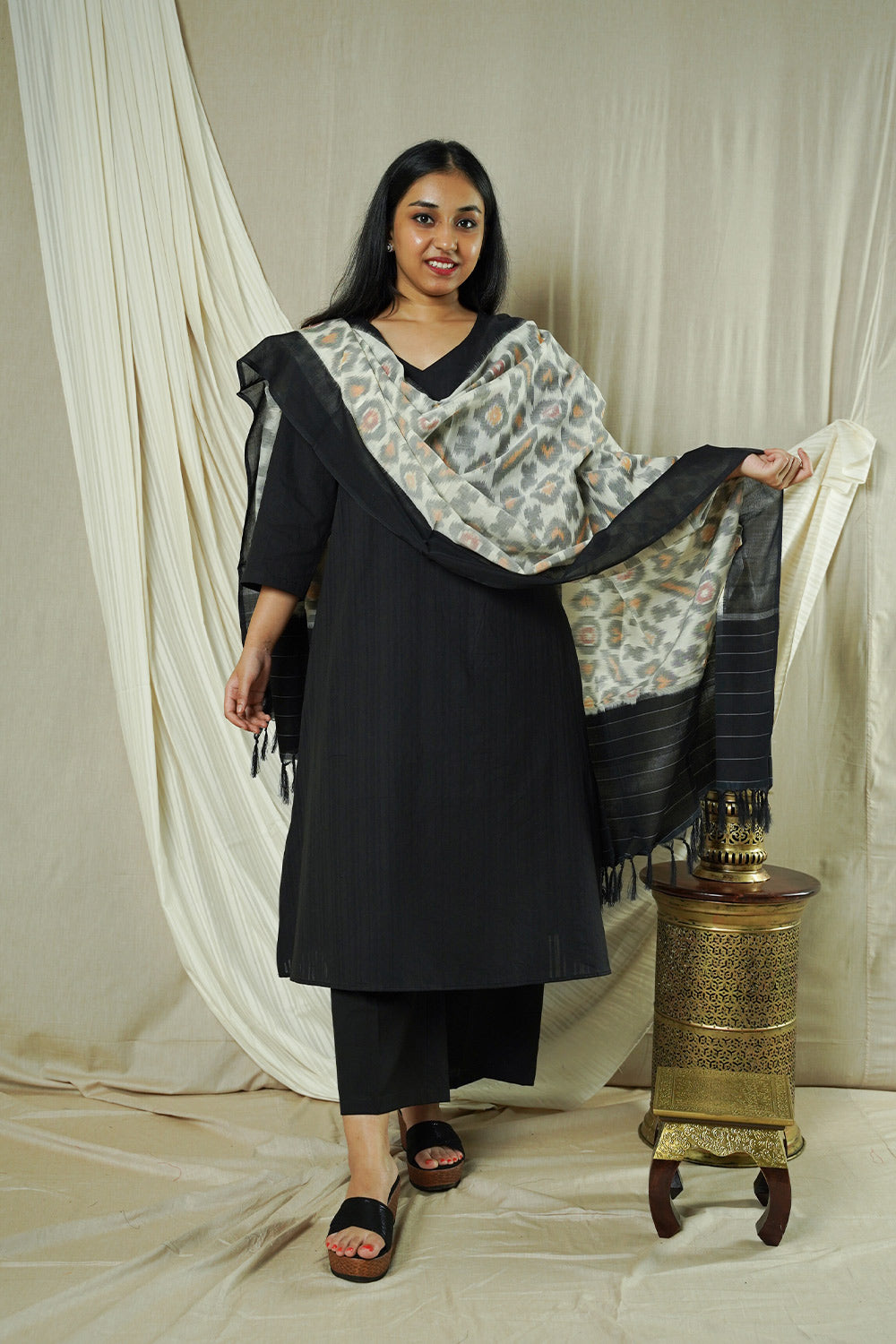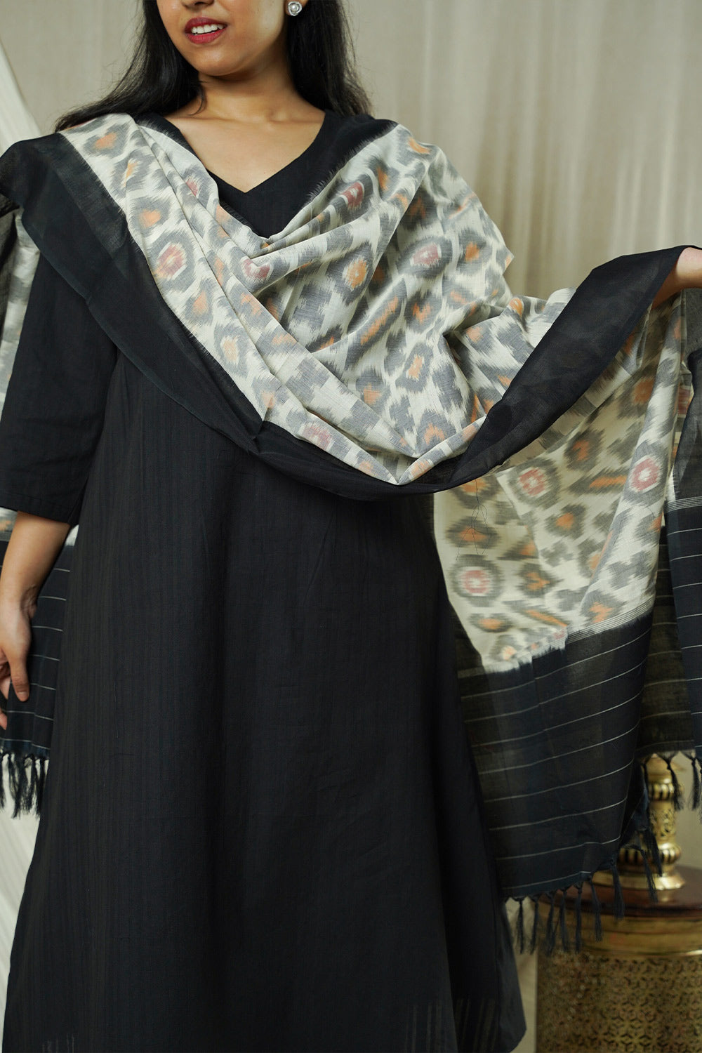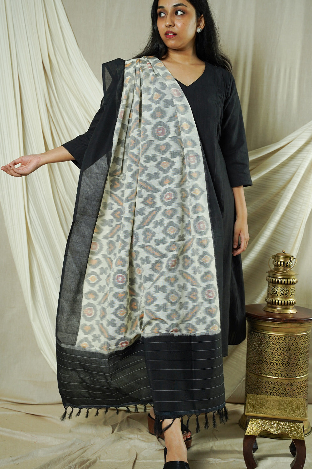 Hand Woven Double Ikkat Cotton Duppata - Grey