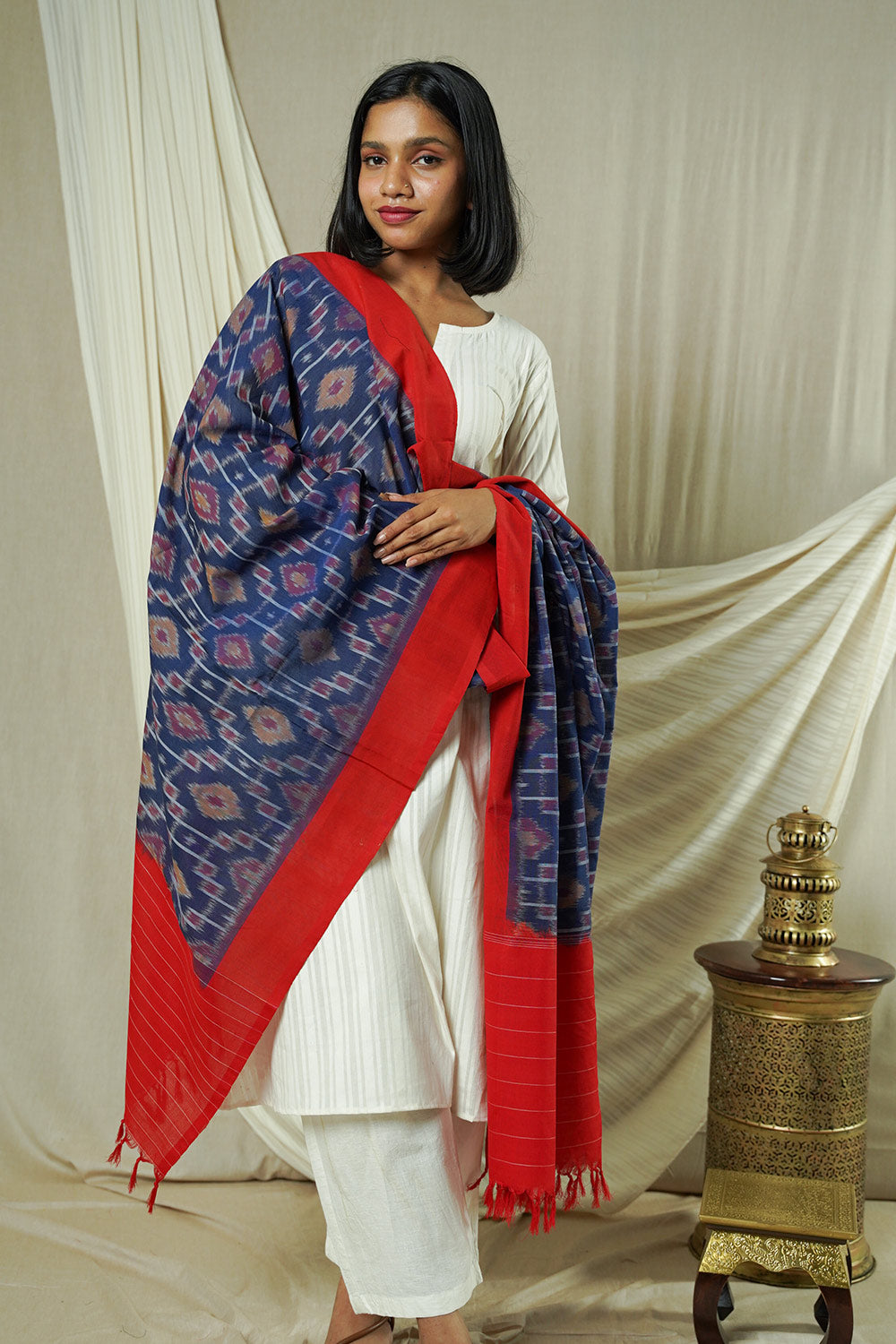 Hand Woven Double Ikkat Cotton Duppata - Navy blue