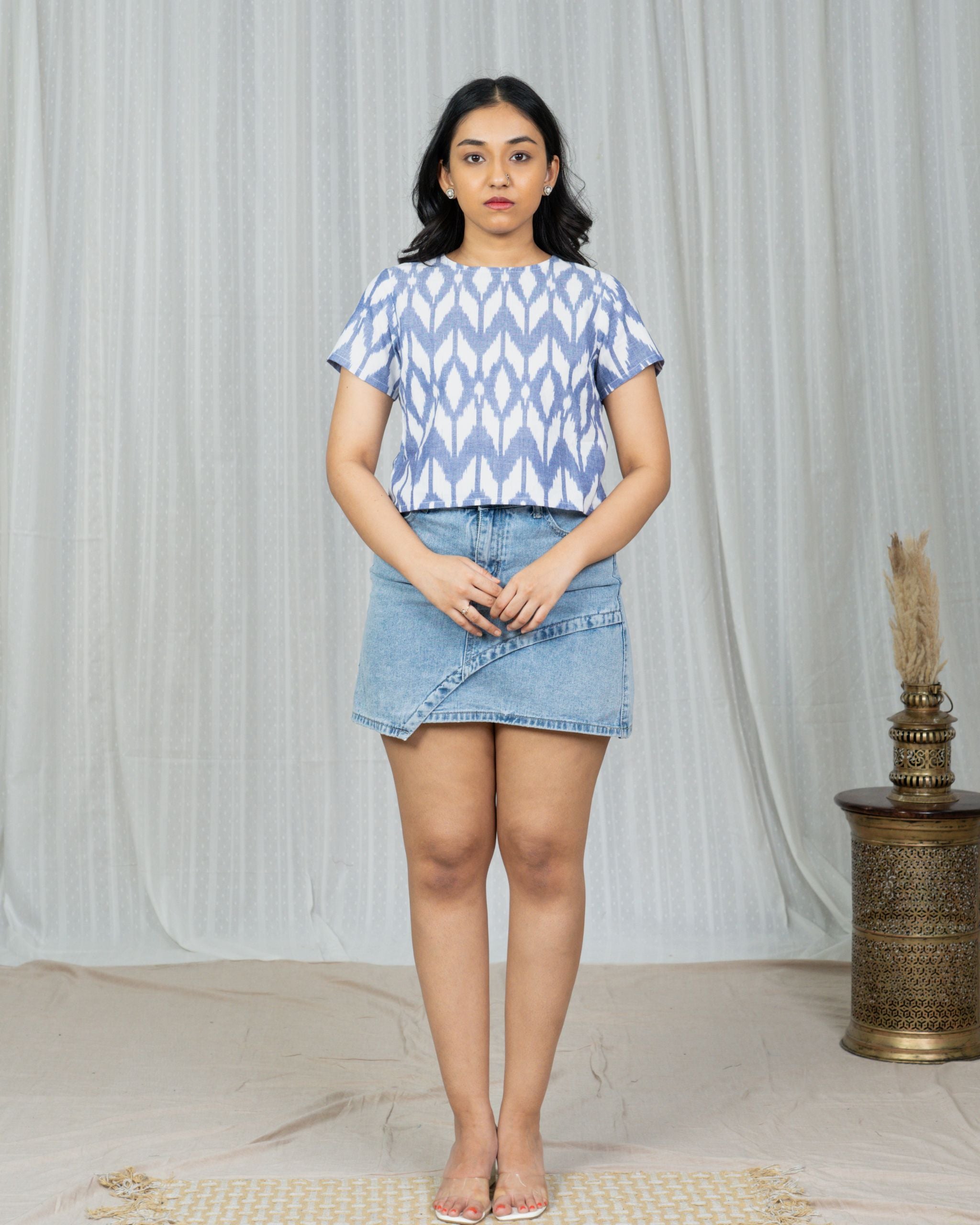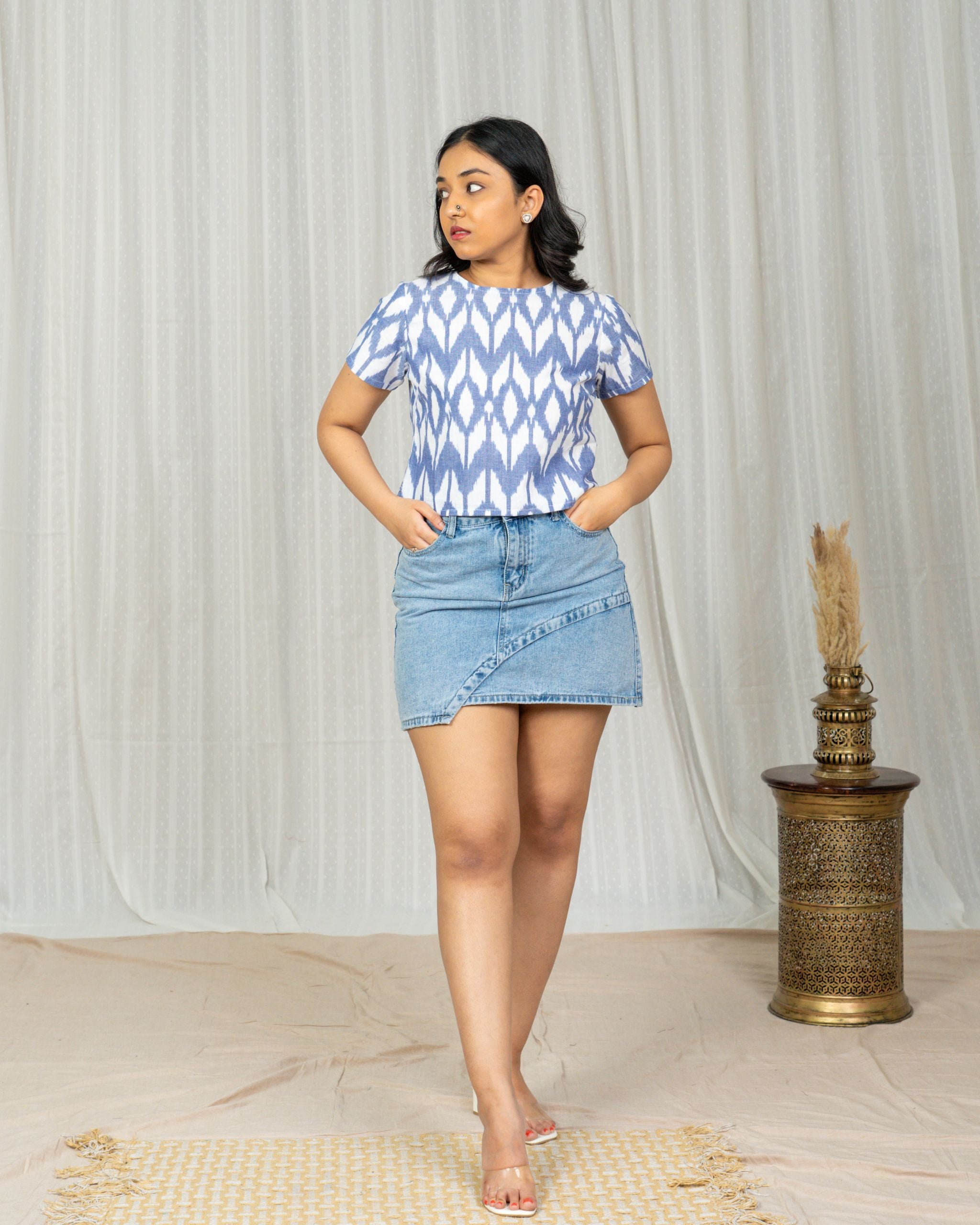 Design: This cap sleeve top features delicate handwoven ikkat all over weave and a classic round neckline.