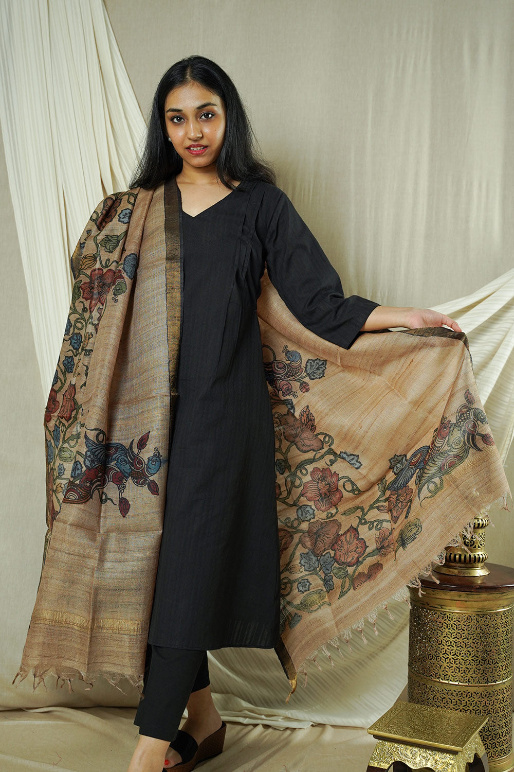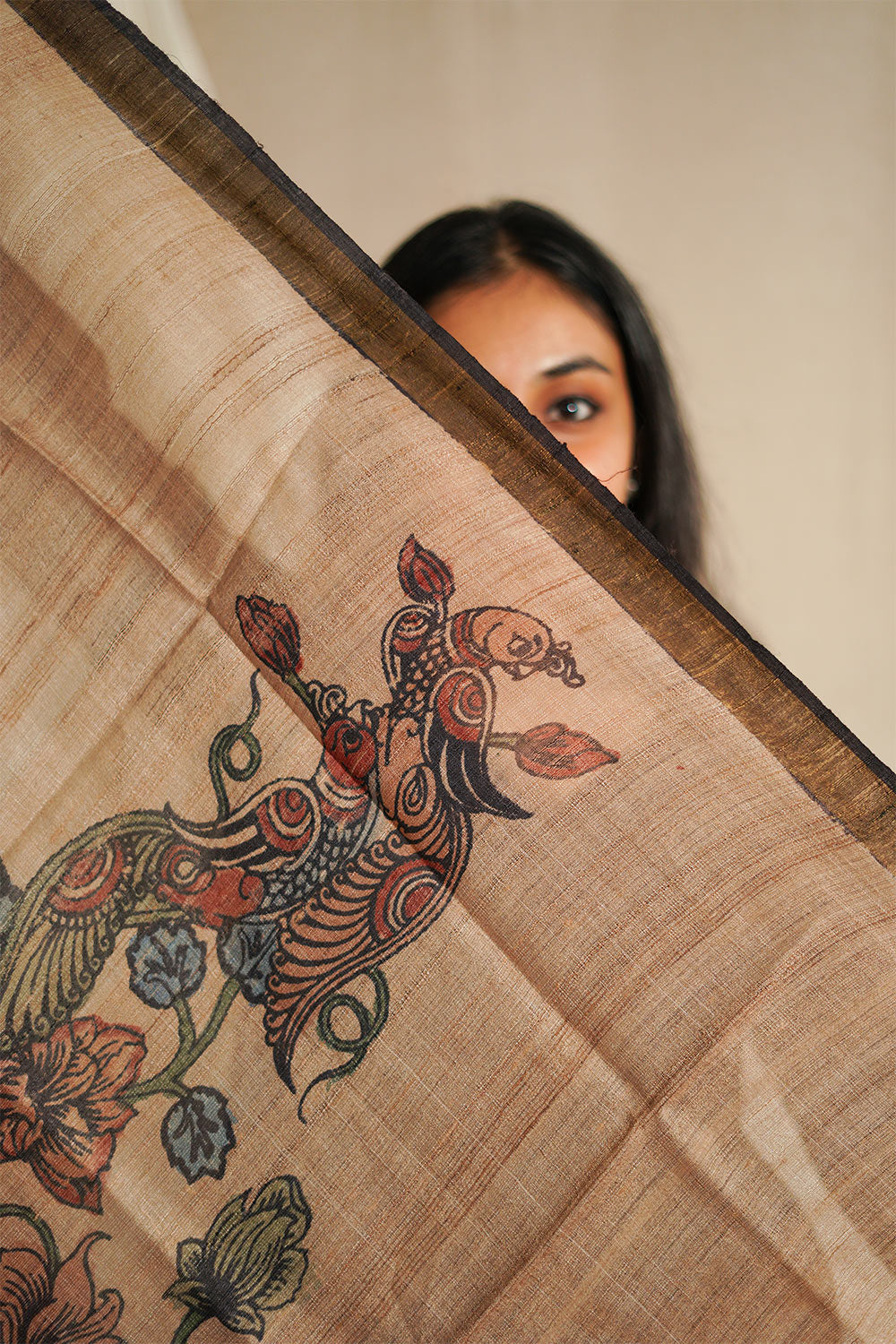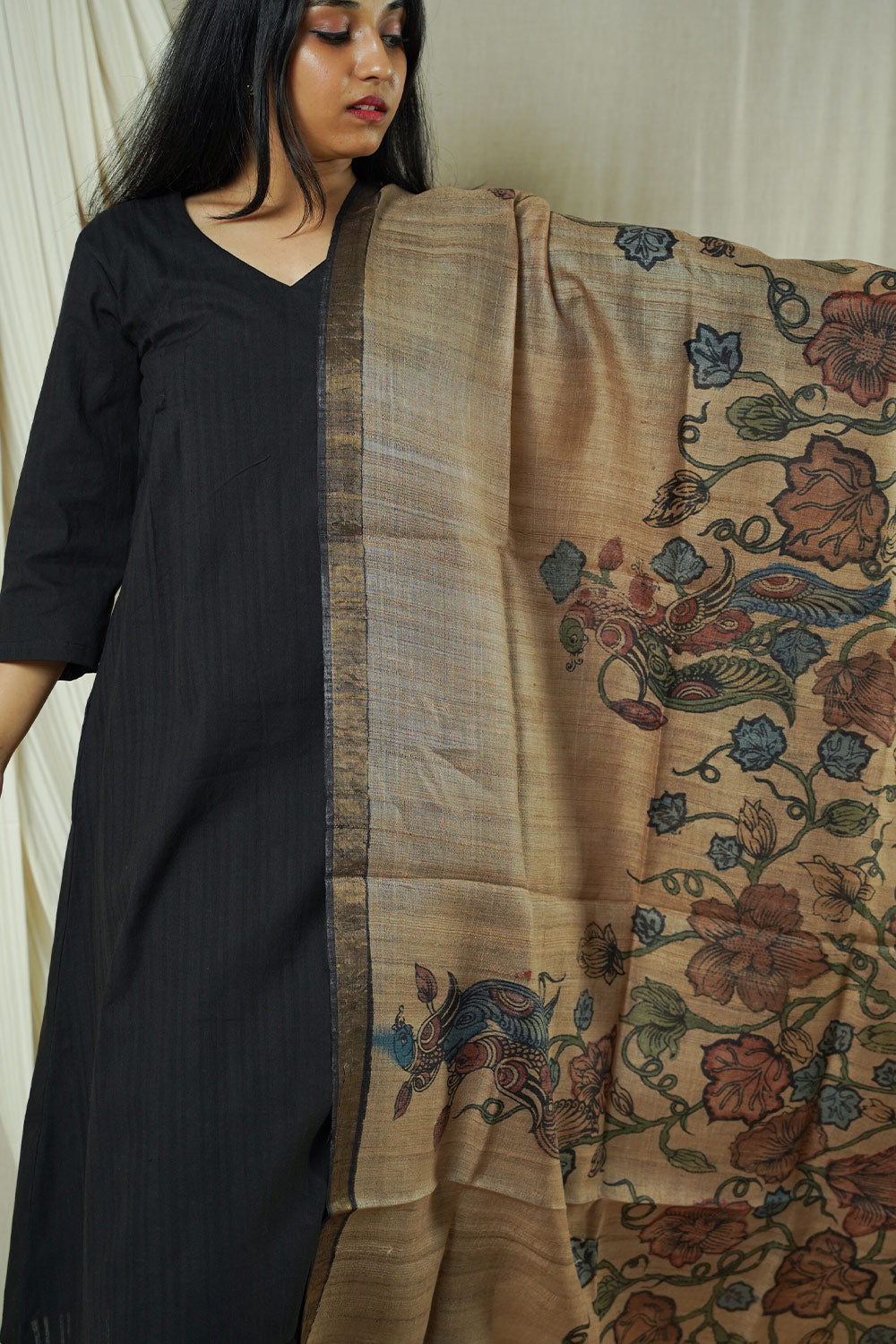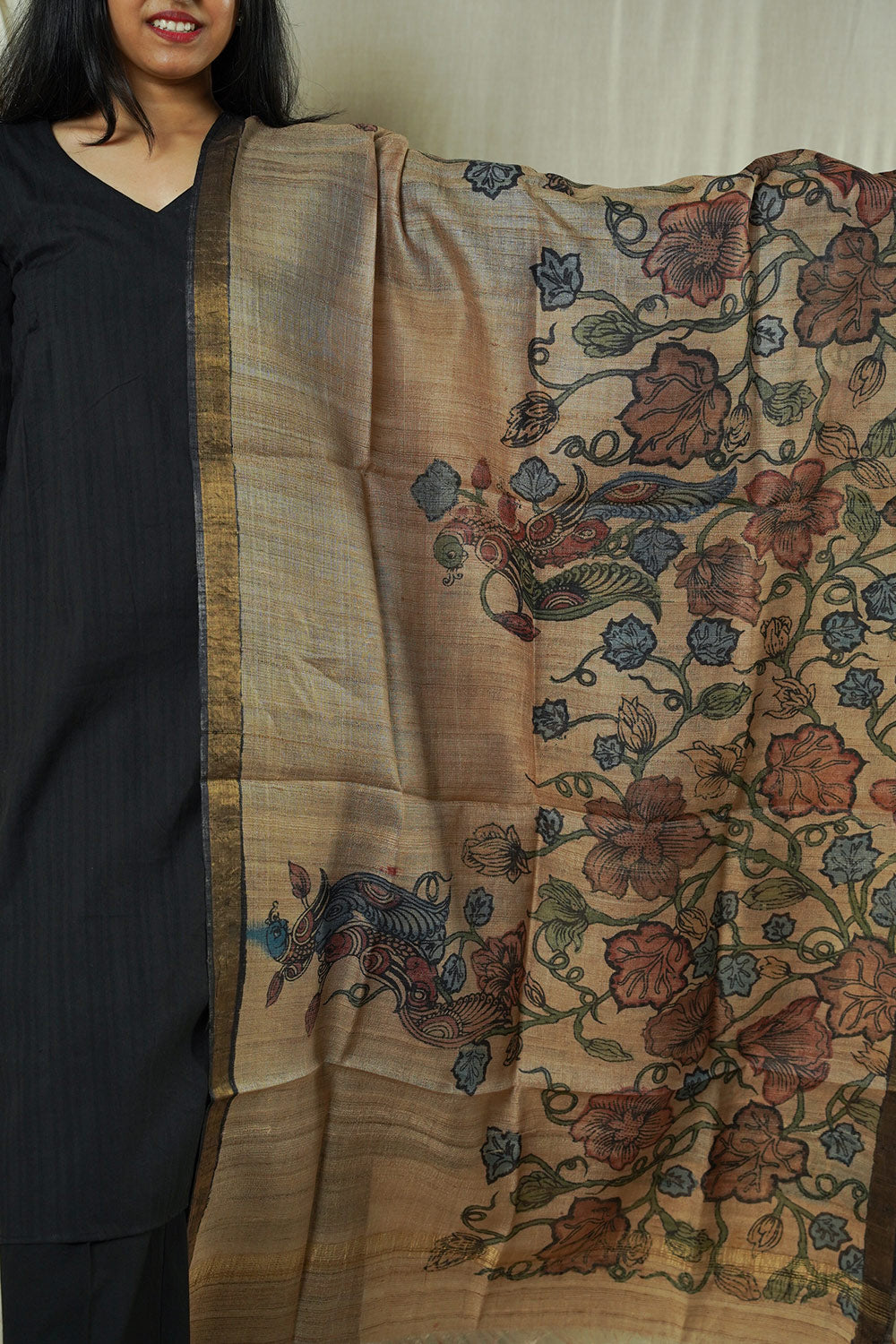 Pen Kalamkari Tusser Silk Duppata - Beige