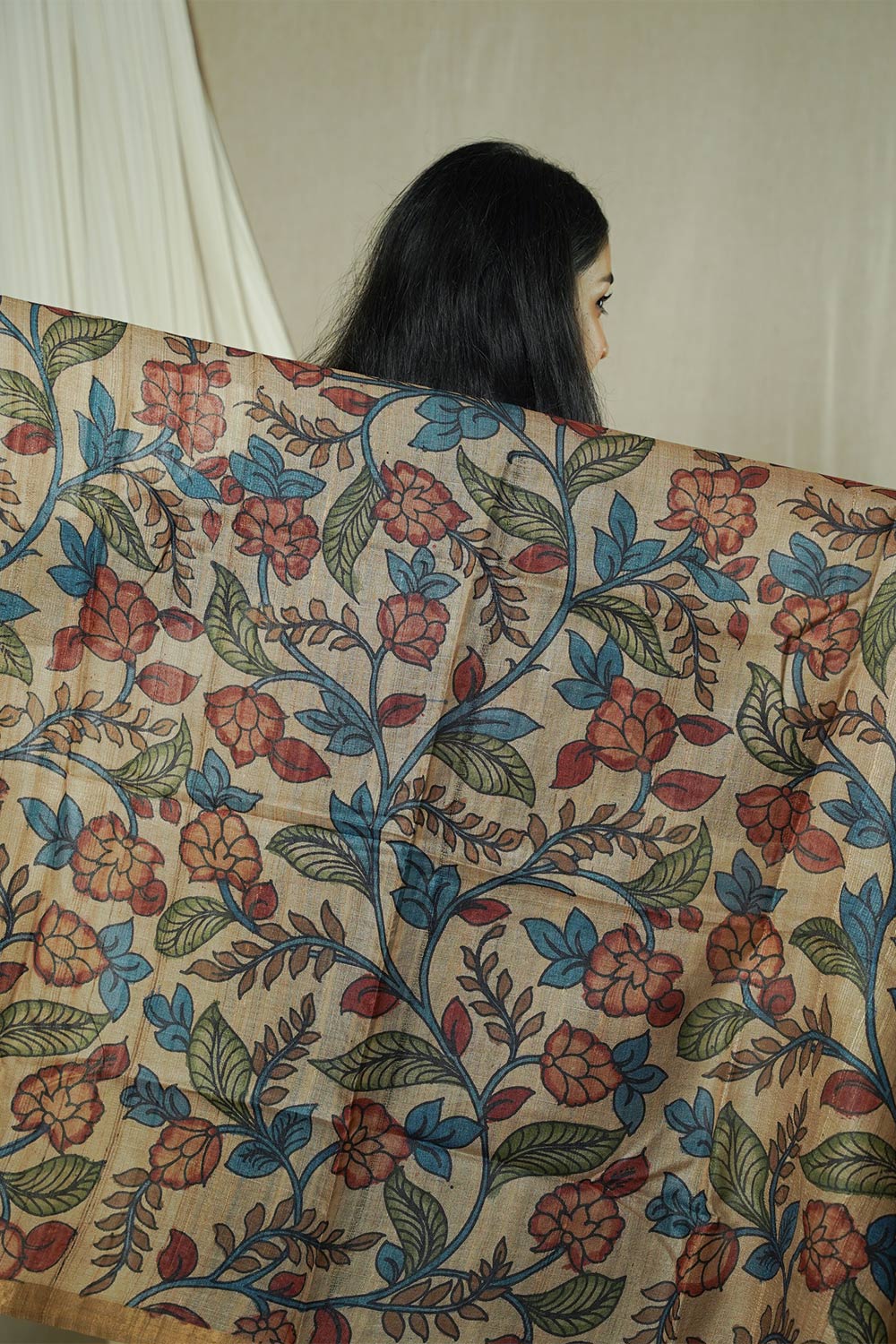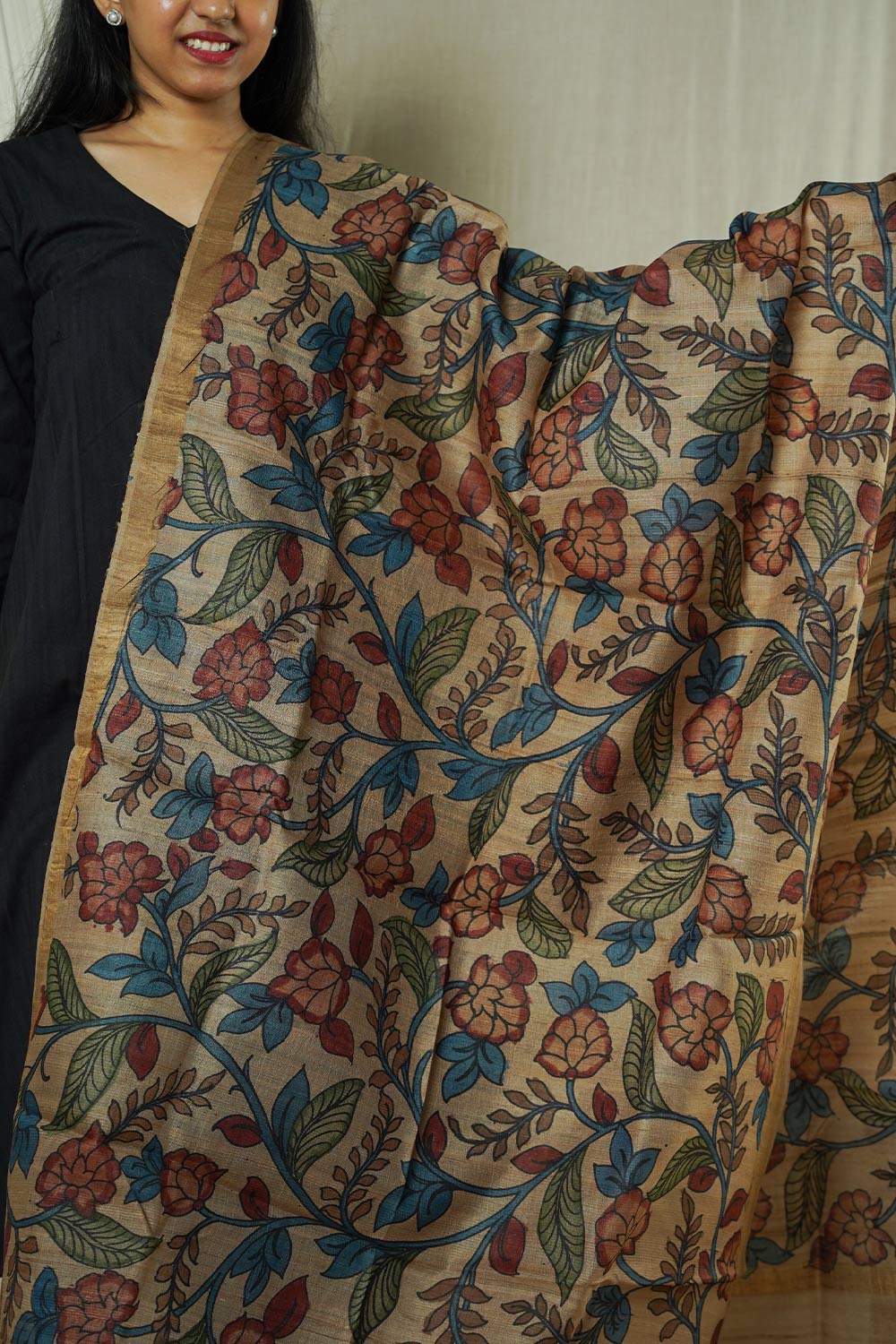 Pen Kalamkari Tusser Silk Duppata - Beige