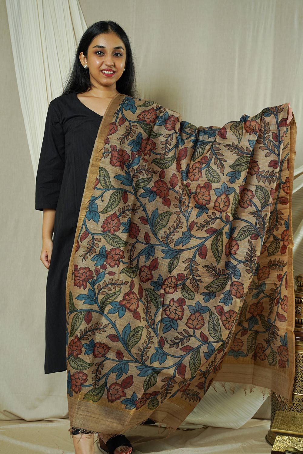 This piece showcases the timeless pen Kalamkari art form, featuring intricate hand-painted floral motifs all over dupatta. The earthy color palette enhances its traditional appeal. - Craft: