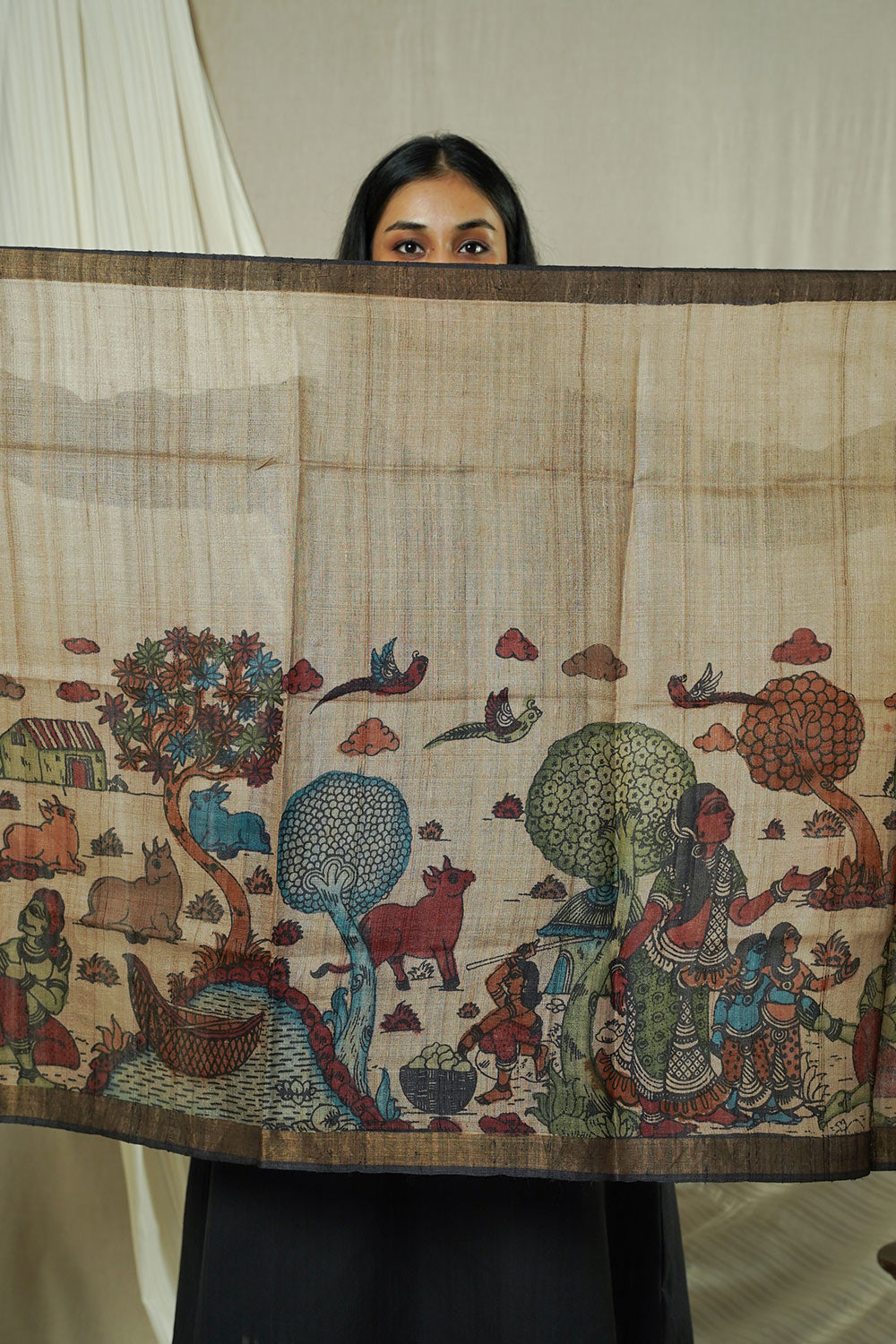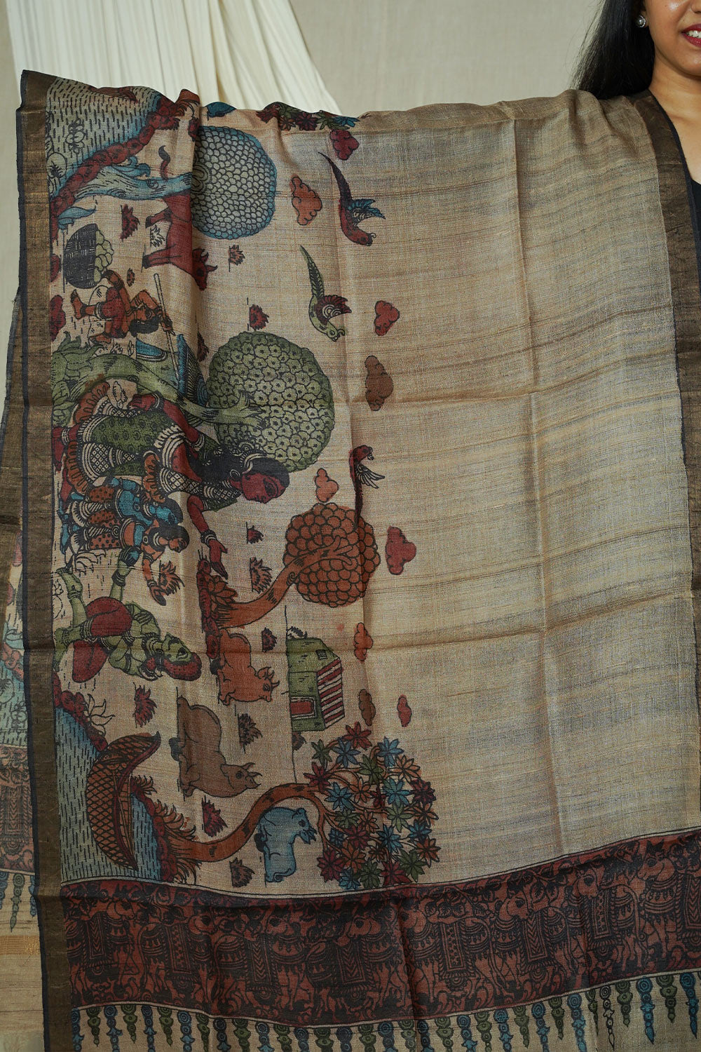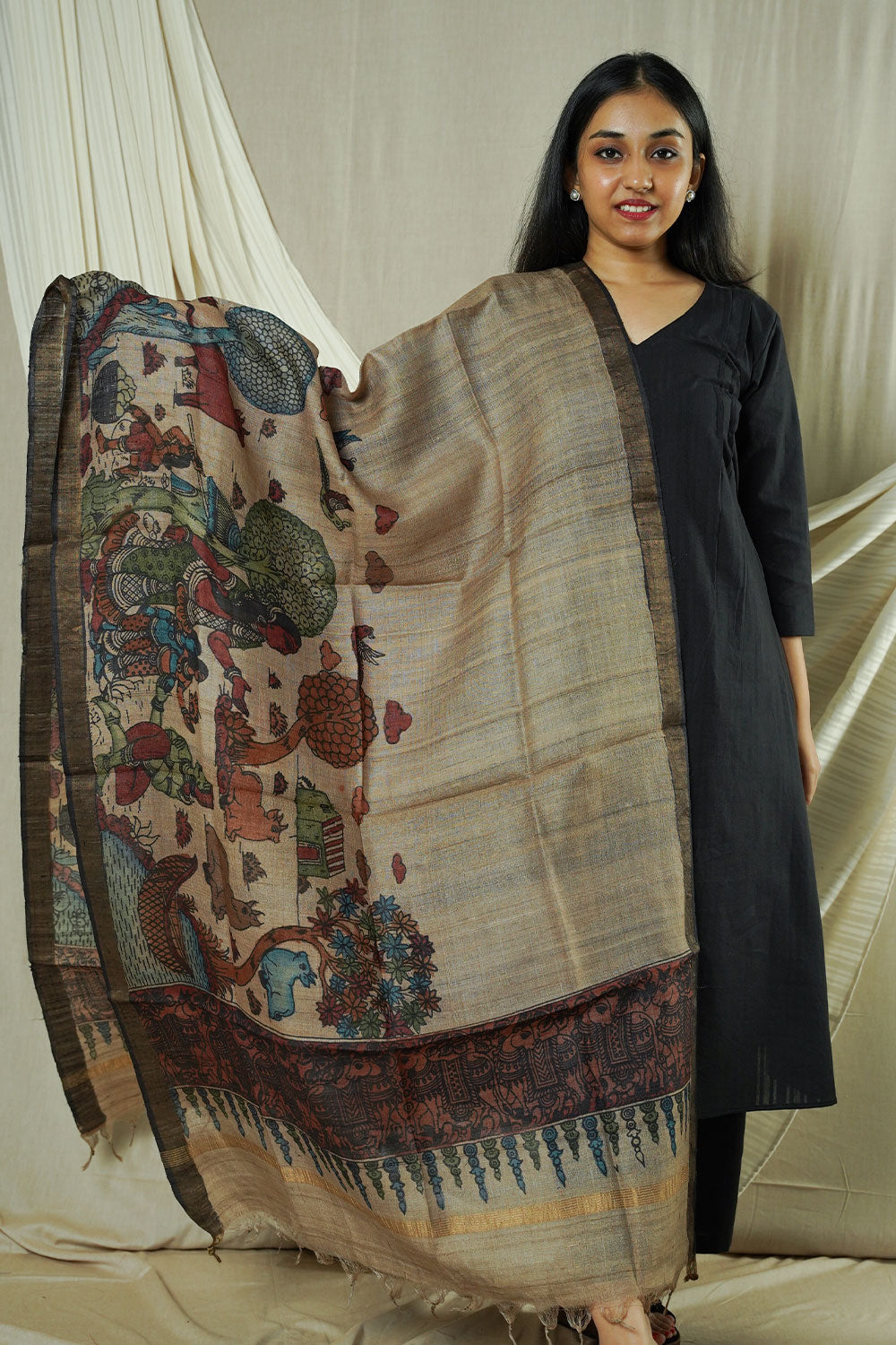 Pen Kalamkari Tusser Silk Duppata - Beige