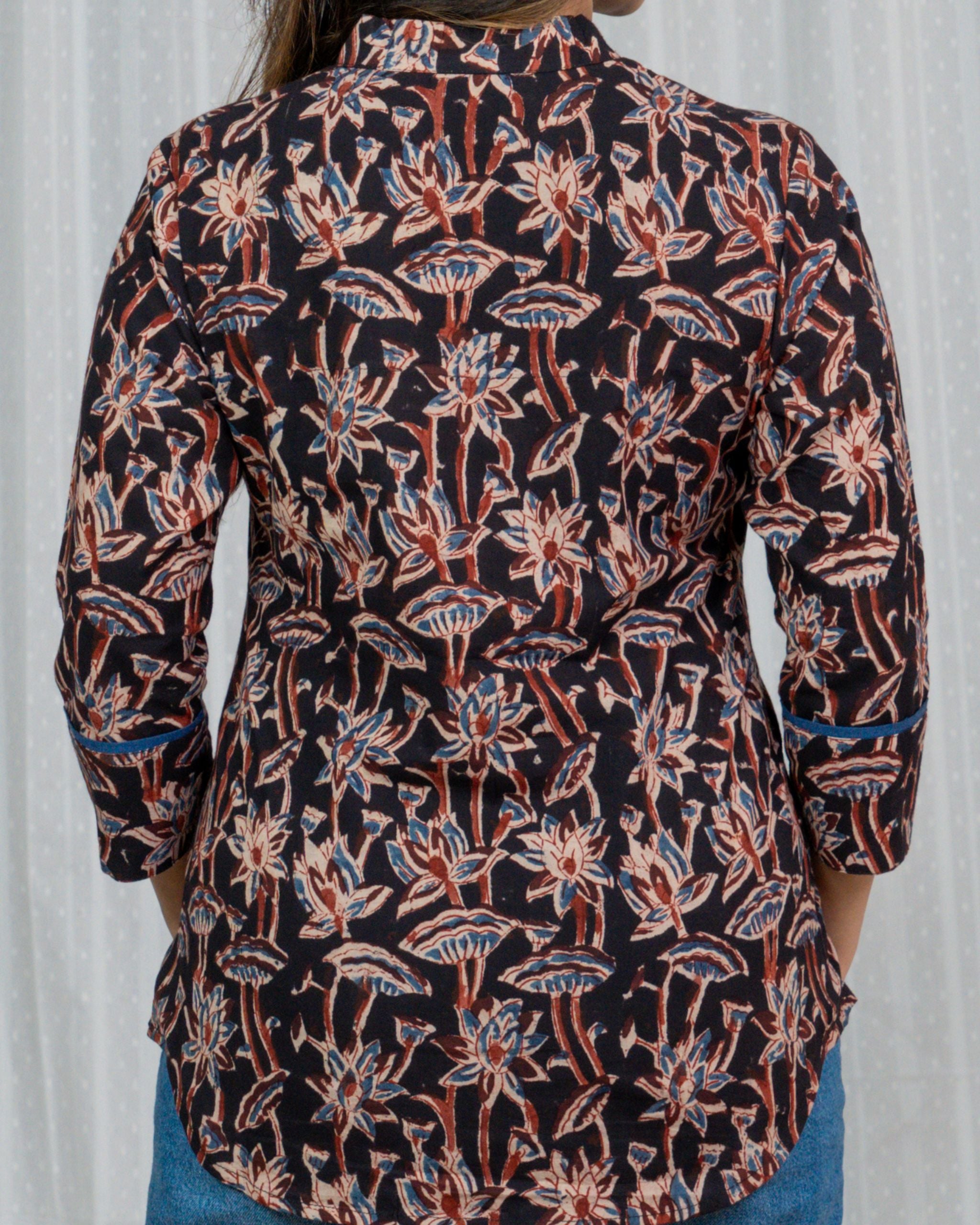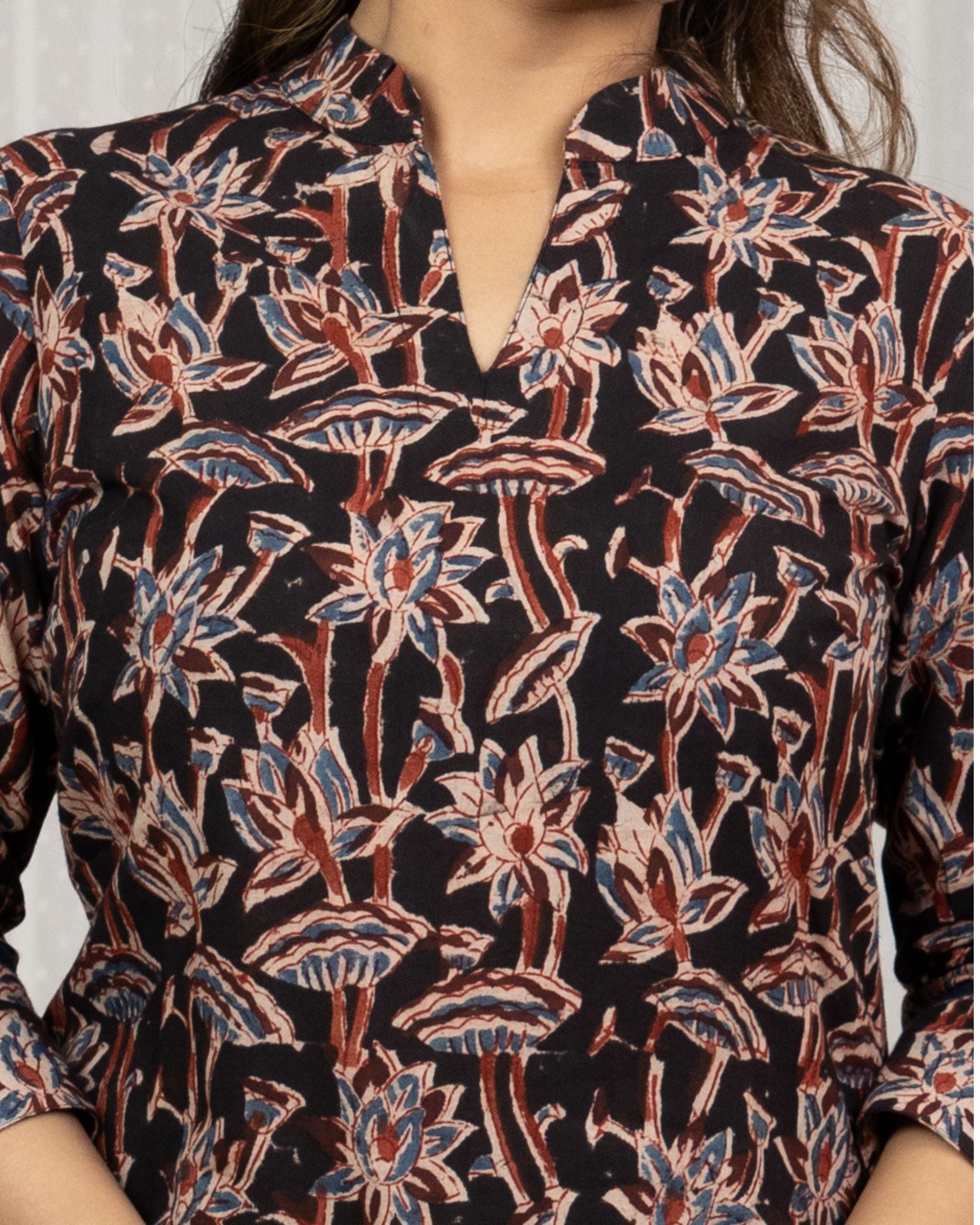 Features: Band collar, Straight fit top, Handblock floral kalamkari