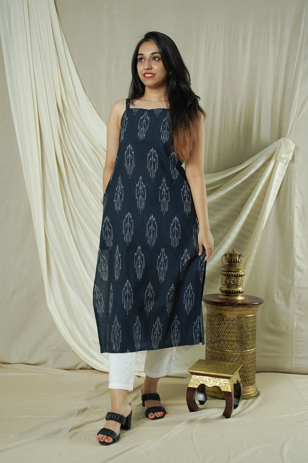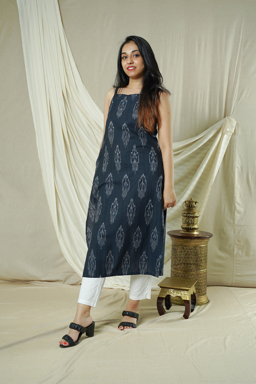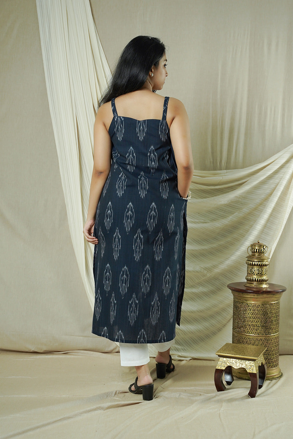 - Fabric: Crafted from premium handwoven Ikat, featuring intricate butta patterns that celebrate the art of Indian weaving.